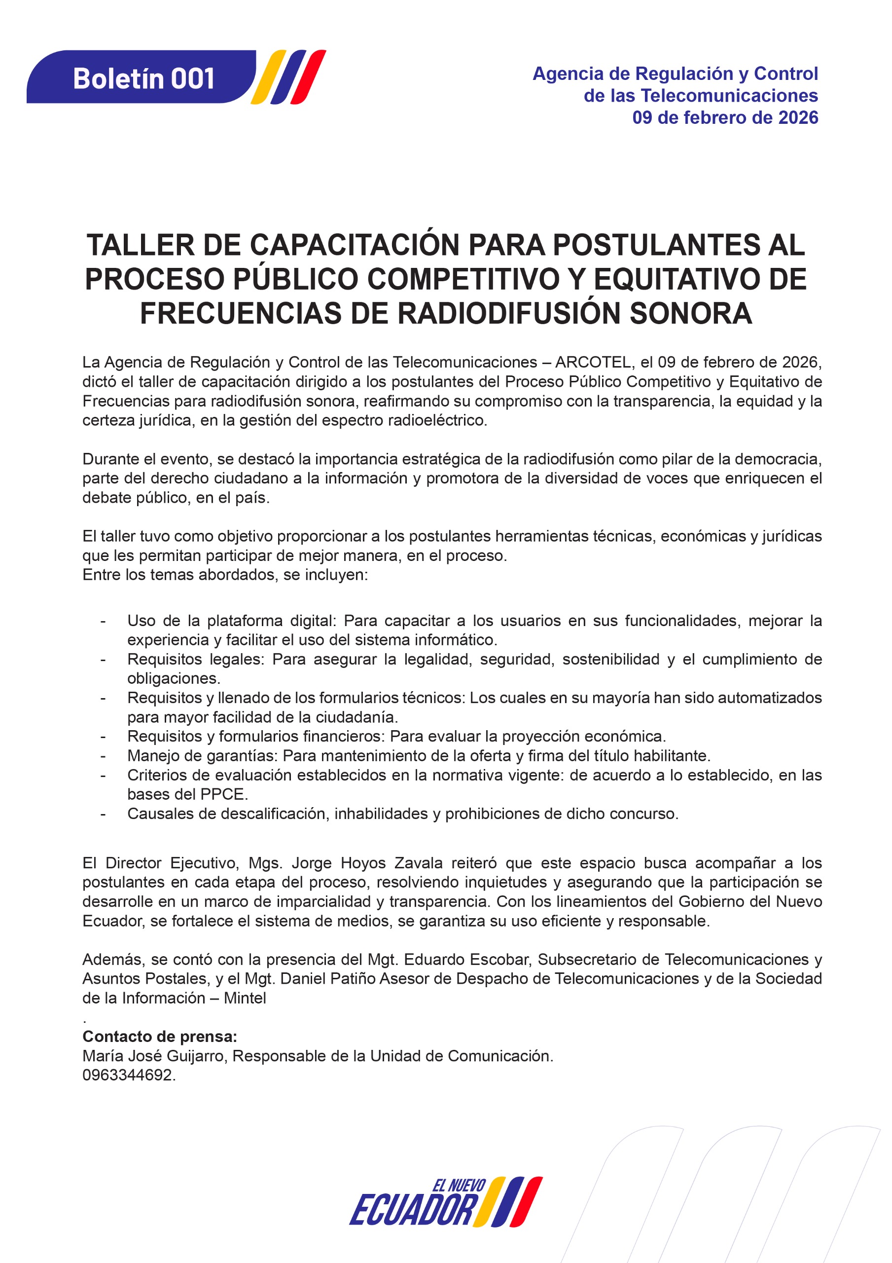La Agencia de Regulación y Control de las Telecomunicaciones – ARCOTEL, el 09 de febrero de 2026, dictó el taller de capacitación dirigido a los postulantes del Proceso Público Competitivo y Equitativo de Frecuencias para radiodifusión sonora, reafirmando su compromiso con la transparencia, la equidad y la certeza jurídica, en la gestión del espectro radioeléctrico.